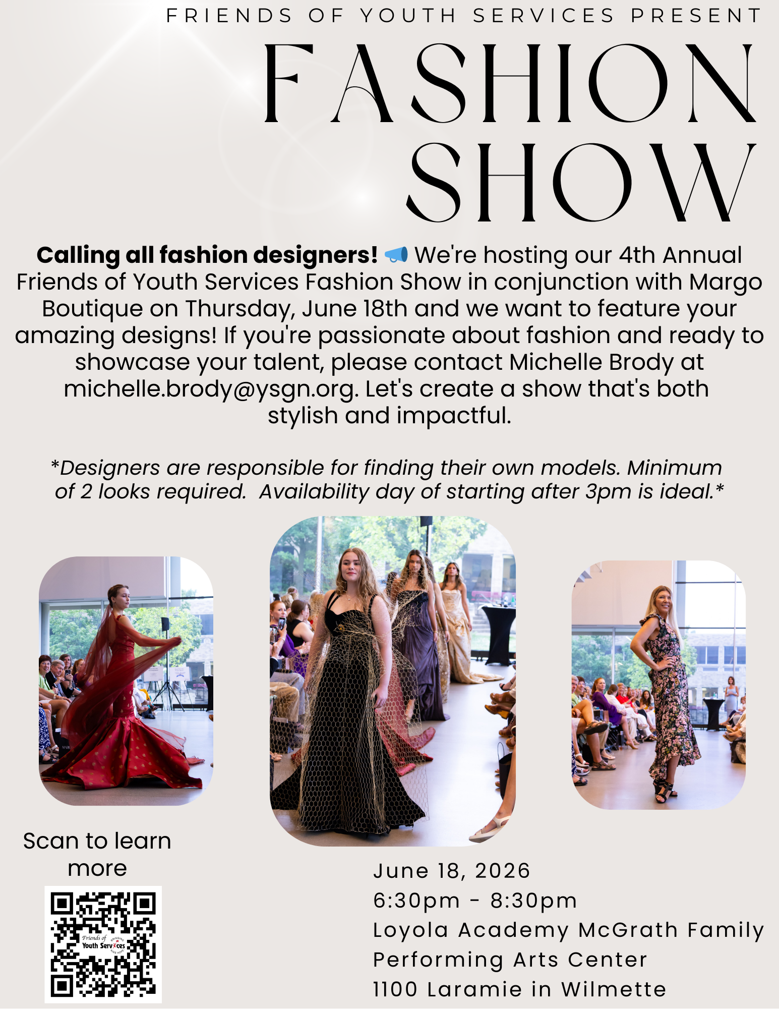 Please join us for the 4th Annual Friends of Youth Services Fashion Show! It promises to be another unforgettable evening of fun, fashion, friendship, and community support. From the stunning creations of talented local fashion students to the trendy pieces from Margo Boutique, there’s plenty of inspiration to refresh your wardrobe. Plus, you’ll get an inside look at the vital work Youth Services does and how your support makes a difference!