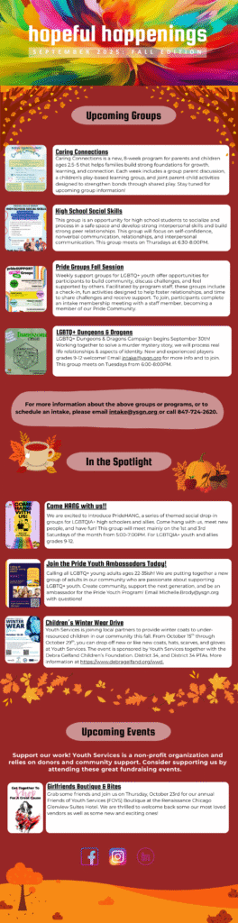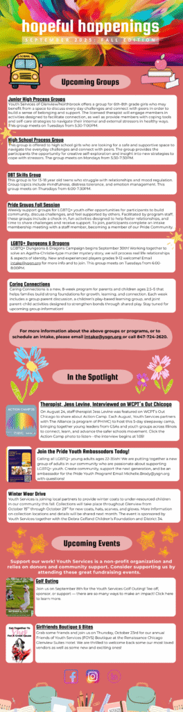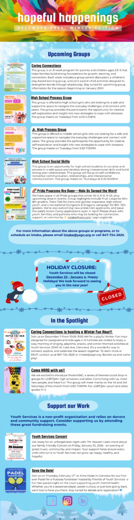 The Youth Services newsletter provides our agency partners and clients the latest information about new or existing therapy groups, upcoming fundraising or community events, and any seminars or presentations in which Youth Services has participated in or provided.