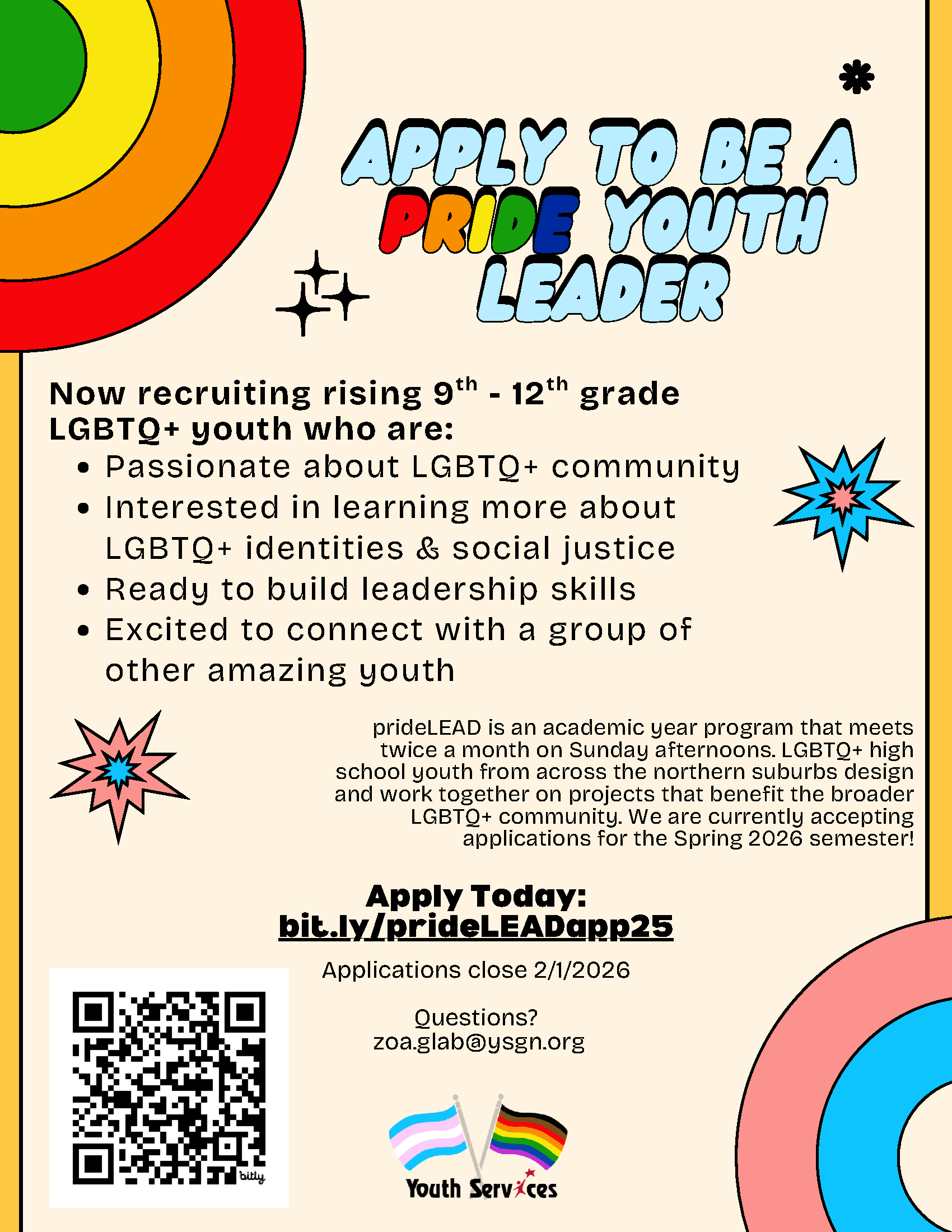 prideLEAD is an academic year program that meets twice a month on Sunday afternoons. LGBTQ+ high school youth from across the northern suburbs design and work together on projects that benefit the broader LGBTQ+ community. We are currently accepting applications for the 2025-2026 school year!
